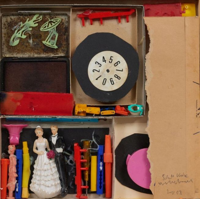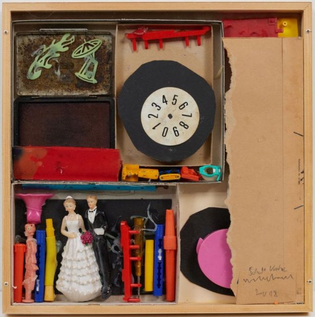 Siegfried Neuenhausen (1931 Dormagen - lebt und arbeitet in Hannover) Gerd Schmidt Vanhove (1950 - 2020) - "Kurzgeschichte 1" - Assemblage. 37 x 37 x 3,5 cm. Sign. und dat. r. u.: Schmidt Vanhove / Neuenhausen / 2018. Im Objektrahmen unter Plexiglas gerahmt.