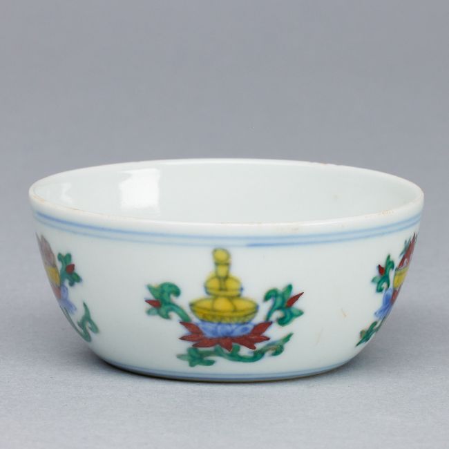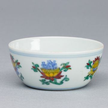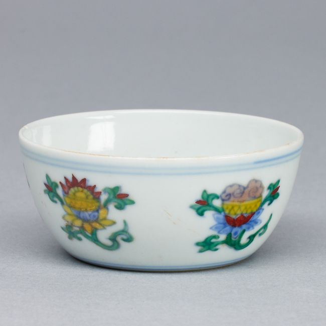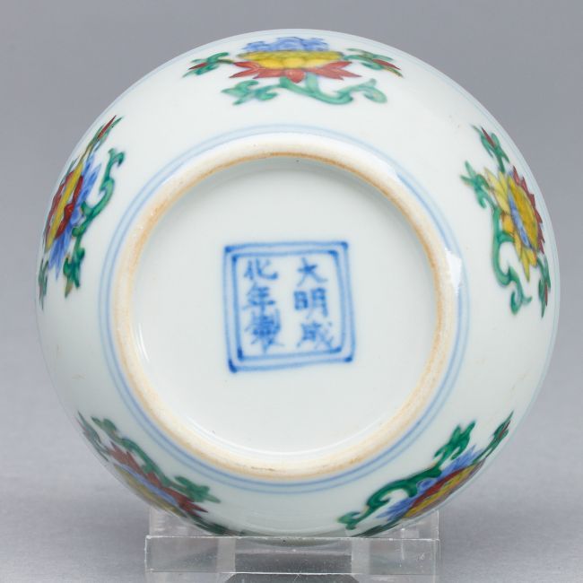 China. Qing Dynastie. Porzellan, glasiert. Blau unter Glasur bemalt. Polychrom auf Glasur bemalt. H. 3,5 cm. D. 7,5 cm. Unterglasurblaue Sechszeichen Bodenmarke in unterglasurblauer, quadratischer Umrandung (Xianhua). Leichte Altersspuren.