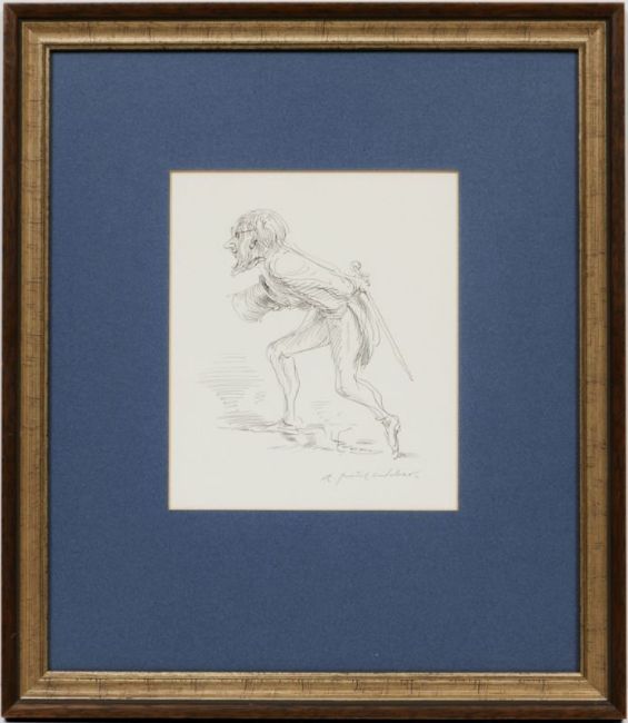 1893 Arnstadt - 1980 Schretstaken - Schreitender Herr mit Zylinder, Brille und Stock - Tusche/Papier. 20 x 17 cm (Passepartoutausschnitt). Sign. r. u.: A. Paul Weber. Passepartout. Unter Glas gerahmt.