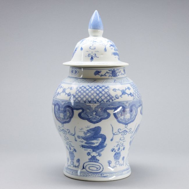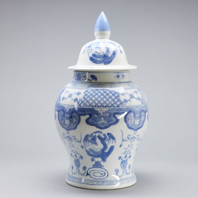 China, 20. Jahrhundert. Porzellan, glasiert, blau unter Glasur bemalt. H. o. / m. Deckel 30 / 45 cm. Minim. Altersspuren.