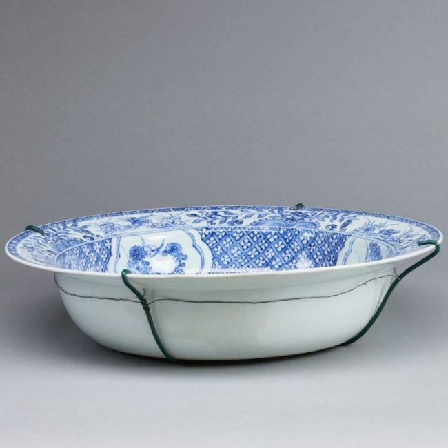 China, 19/20. Jahrhundert. Porzellan, glasiert, unterglasurblau bemalt. H. 9 cm. D. 39 cm. Rand der Schüssel mit Sprüngen und größtenteils repariert. Spuren von Alter.