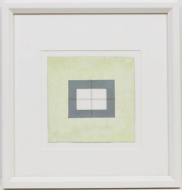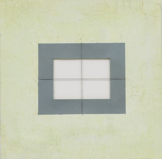 1956 Osterholz-Scharmbeck - Ohne Titel - Öl, Gummifäden/Lwd. 20 x 20 cm. Verso auf Galerieetikett (Galerie Depelmann, Langenhagen) bez. Passepartout. Unter Glas gerahmt. Voll ansichtig unter Glas gerahmt. - Provenienz: Galerie Depelmann, Langenhagen.