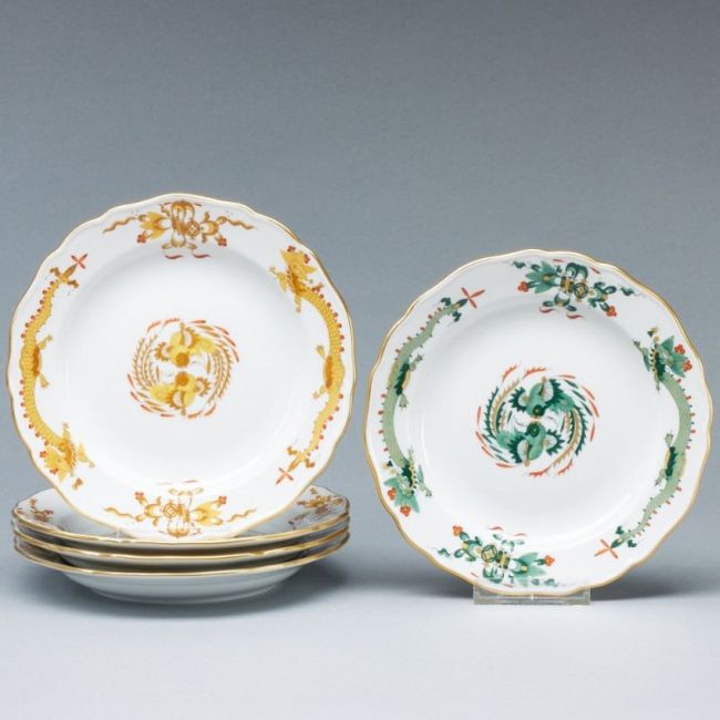 Staatliche Porzellan Manufaktur, Meissen. Porzellan, weiß, glasiert. Goldrand. Unter der Glasur blaue Schwertermarke. Gelb, Rot und Gold bemalt. 1x 1972-1980, 1. Wahl, 1x 1980, 1. Wahl, 2x 1980, drei Schleifstriche, Dekornr. 321610 (3x) und 140 (1x). H. 2,5 cm, D. 18 cm. ---- Grün, Rot und Gold bemalt. 1980, drei Schleifstriche, Dekornr. 321310. H. 2,5 cm, D. 18 cm.