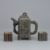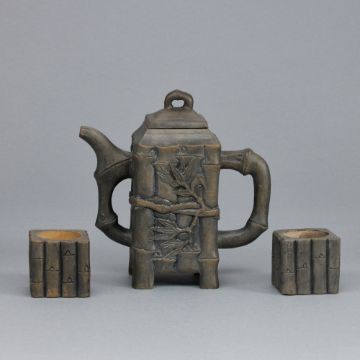 China, 20. Jahrhundert. Je Ton, braungrau gefasst. H. Kanne 14,4 cm. H. Becher H. 4,1 cm. Unterseite Kanne eingeritzte Bodenmarke. Die Teekanne mit Bambusdekor, die Becher passend gestaltet.