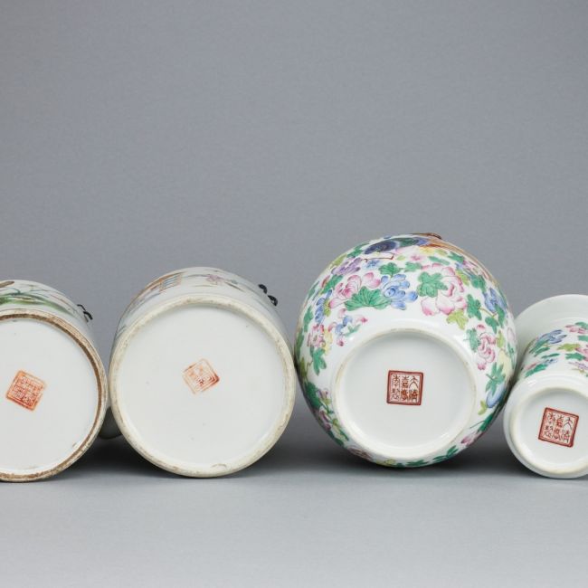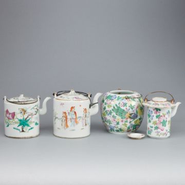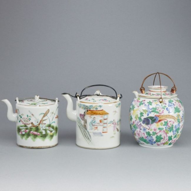 China, 19. / 20. Jahrhundert. 1 Teekanne, 19. Jh. Porzellan, glasiert, polychrom u. in Gold auf Glasur bemalt; Metallhenkel. H. 12,5 cm. Rote Aufglasur Siegel-Bodenmarke. Leichte Alters- u. Gebrauchsspuren, Öffnungskante minim. Chip, minim. ber. 1 Teekanne, 19. Jh. Porzellan, glasiert, polychrom u. in Gold auf Glasur bemalt (famille rose); Metallhenkel. H. 14,2 cm. Rote Aufglasur Siegel-Bodenmarke (Tongzhi). Leichte Alters- u. Gebrauchsspuren, Ausguss 2 Chips, leicht ber. 1 Reisweinkanne, 20. Jh. Porzellan, glasiert, polychrom auf Glasur bemalt; Metallhenkel. H. 15,1 cm. Auf Außenkorpus u. Innenkännchen aufglasurrote Siegel-Bodenmarke. Bemalung des Innenkännchens vereinzelt leichtes Krakelee.