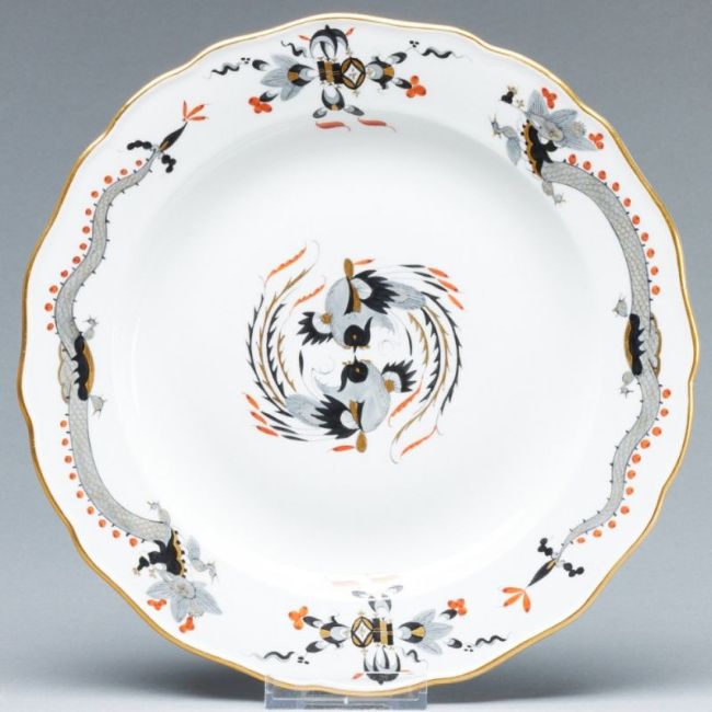 Staatliche Porzellan Manufaktur, Meissen 1924-1934. Porzellan, weiß, glasiert. Schwarz, Rot und Gold bemalt. Goldrand. Unter der Glasur blaue Schwertermarke. 1. Wahl. H. 2,8 cm, D. 25,5 cm.