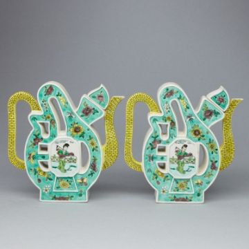 China, 20. Jahrhundert. Je Porzellan, glasiert, polychrom auf Glasur bemalt. H. 21 cm. 1 Tk.: minim. Manufakturmängel. 1 Tk.: minim. Chip an Tülle.