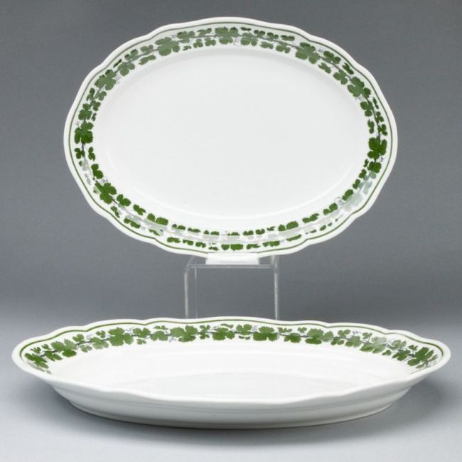 Staatliche Porzellan Manufaktur, Meissen. Porzellan, weiß, glasiert. Unter der Glasur grün bemalt. Unter der Glasur blaue Schwertermarke. H. 5 cm, 26,5 x 36 cm (1980, drei Schleifstriche, punktueller Glasurfehler) und H. 4,5 cm, 30 x 45,5 cm (1935-1947, zwei Schleifstriche, fünf Flugaschepunkte).