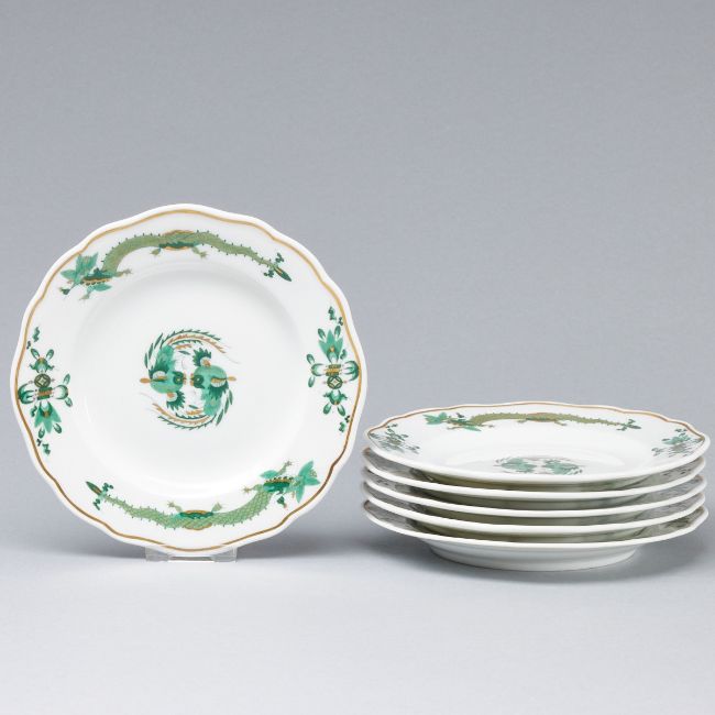 Staatliche Porzellan Manufaktur, Meissen 1935-1947. Porzellan, weiß, glasiert. Grün und Gold bemalt. Goldrand. Unter der Glasur blaue Schwertermarke. Vier Schleifstriche. H. 2 cm, D. 16 cm.
