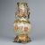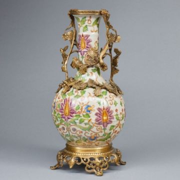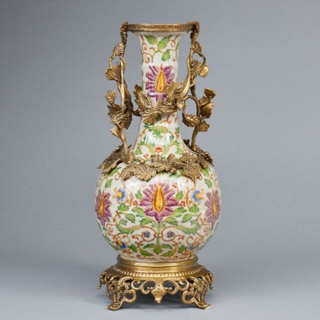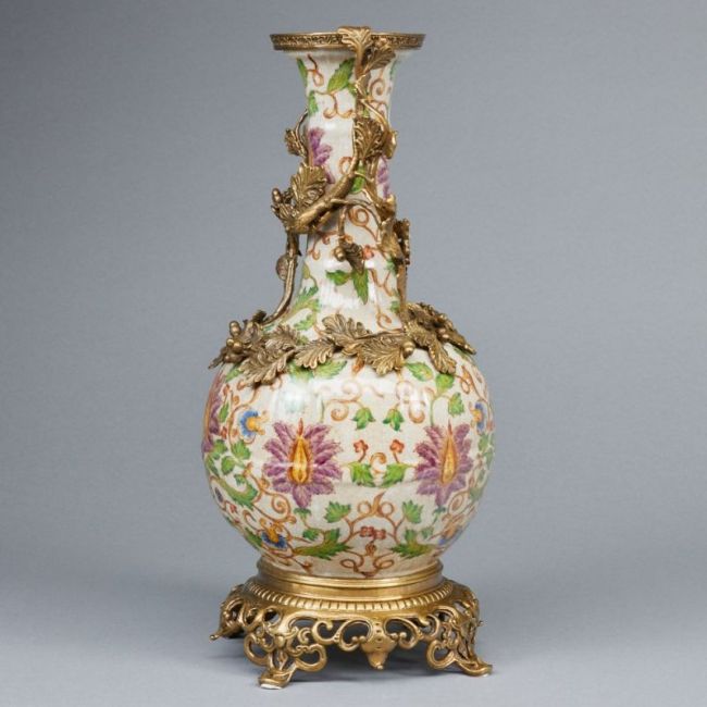 China, 20. Jahrhundert. Porzellan, Messing. Beige glasiert, Polychrom bemalt. Metallrand. Messingmontierung. H. mit Montierung: 38, 5 cm. Glasur mit leichtem Krakelee. Altes-u. Gebrauchsspuren.