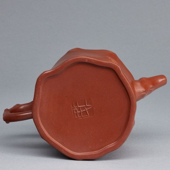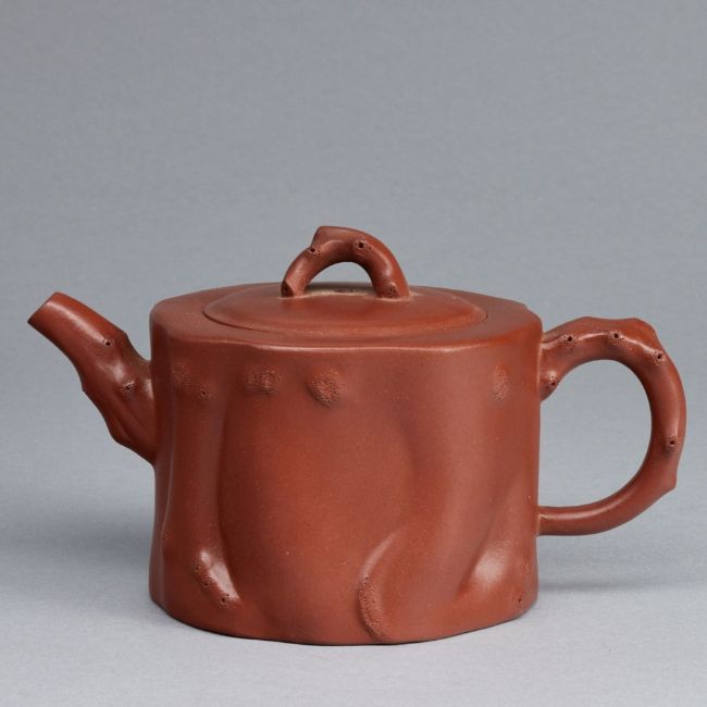 China. 20. Jahrhundert. Ton, dunkelbraun. Bodenmarke. H. 10, 5 cm. Minim. Alters- u. Gebrauchsspuren. Baumstammförmiger Ausguß und Baumstammförmige Handhabe.