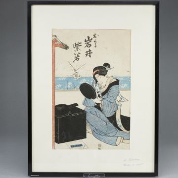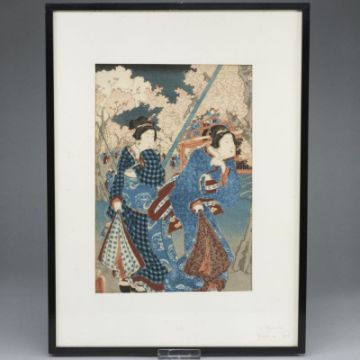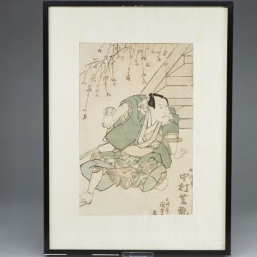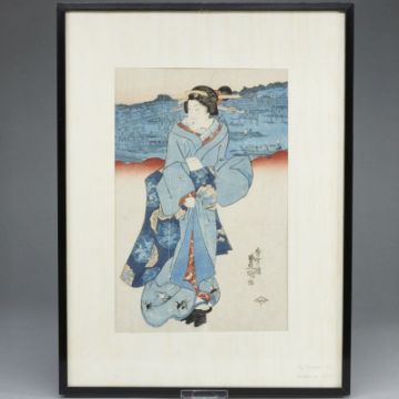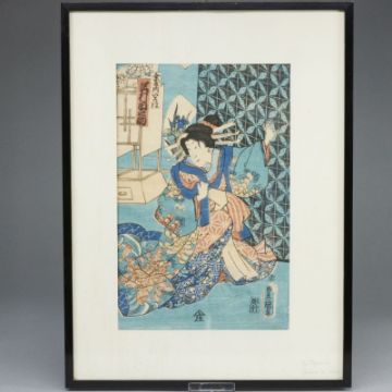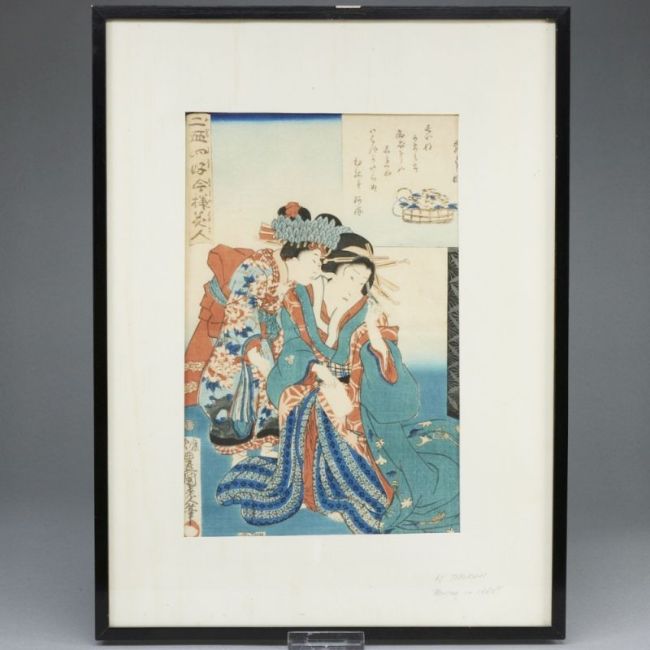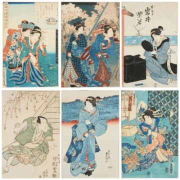 Utagawa Kunisada (Toyokuni III & IV) 1786 Edo - 1864 Edo Farbholzschnitt/Papier. Je 33 x 21,5 cm (Passepartoutausschnitt). Unter Glas gerahmt. Ungeöffnet. Teilweise Faltenbildung, ein Holzschnitt mit Löchern, rest., Abreibespuren und part. gebräunt. Part. Knickspuren.