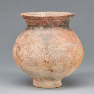 Mittelmeerraum, wohl Bronzezeit. Hellroter Ton. Gereinigter Bodenfund. H. 20 cm, B. 18 cm, D. 14,5 cm. Eingeritztes Dekor. Altersbedingte Gebrauchsspuren.