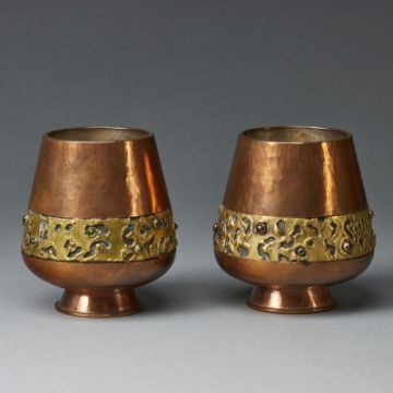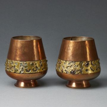 Frühes 20. Jh. Gehämmertes Kupfer, dekoriert mit Gelbgussring und eingestzten Halbedelsteinen. Nicht identifizierte Minipunze. H. 10 cm. - Prov.: Privatsammlung.