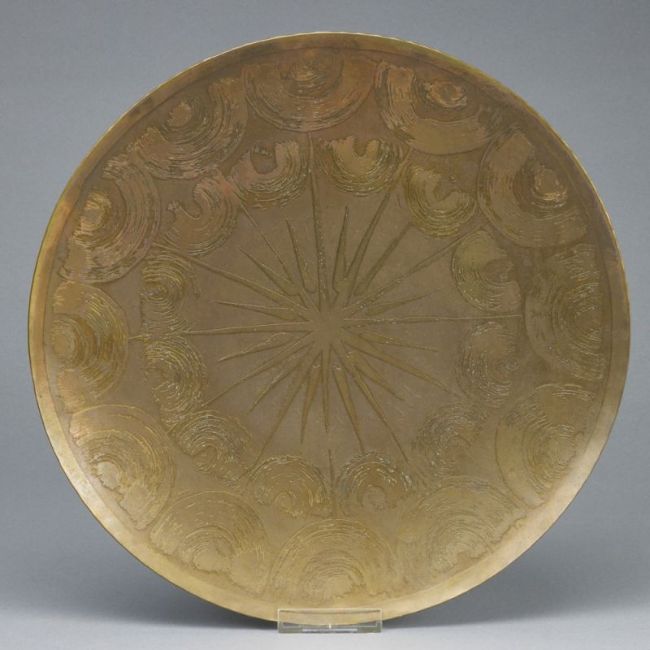 Erste Hälfte 20. Jh. Messing. Ausgeätztes Dekor mit Sonnenuhr im Zentrum, zweimaliger 12er Einteilung. D. 34 cm. Spuren von Alter und Gebrauch. Rückseitig Kleberückstände von Aufklebern. - Prov.: Privatsammlung.