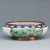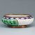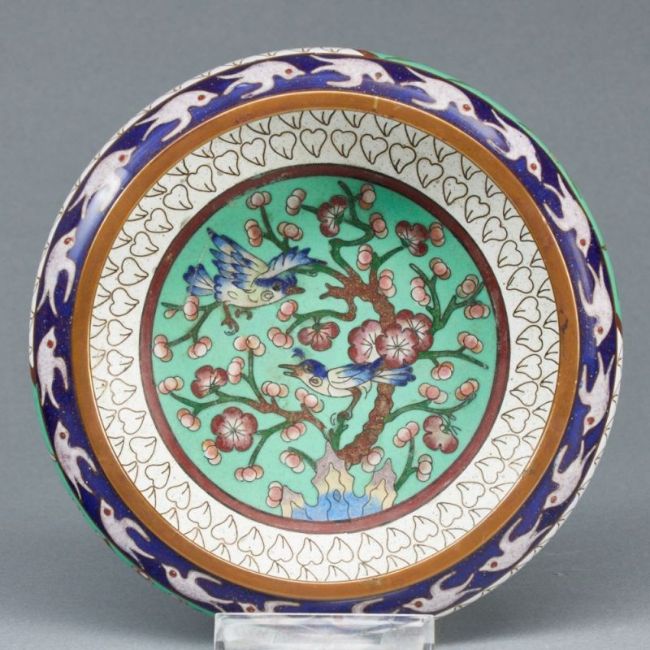 China, Qing Dynastie, 20. Jahrhundert. Wohl von Jingàilán (wörtlich: Blau der Jingtai). Messing, Emaille, D.16 cm, D.der Öffnung: 12.5 cm, H. 6 cm. Zustand: Leicht Spuren von Alter. und Gebrauch. Der äußerste Rand des Tellers ist blau mit weißen Taubenmustern. Der zentrale Teil des Tellers ist grün mit detaillierten Blumen- und Blattmustern in verschiedenen Farben, einschließlich Braun, Blau und Weiß. Um das grüne Zentrum herum befindet sich ein weißer Rand, der ein kompliziertes Muster aufweist, das wie stilisierte Blätter oder Blütenblätter in Braun erscheint. Der blaue Boden ist typisch für die historische Manufaktur Jingàilán.
