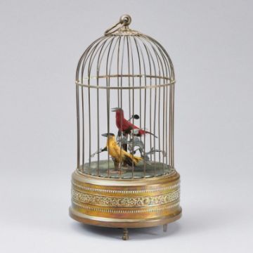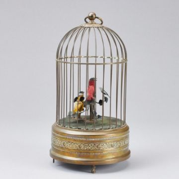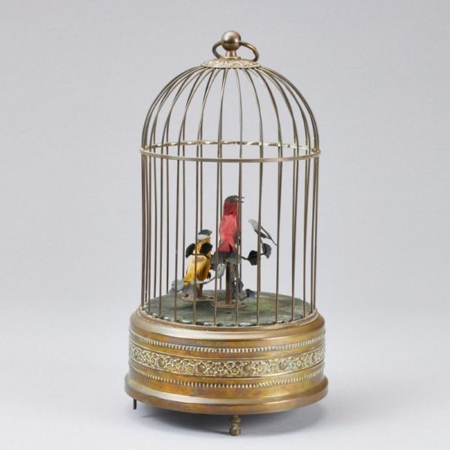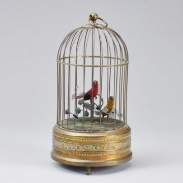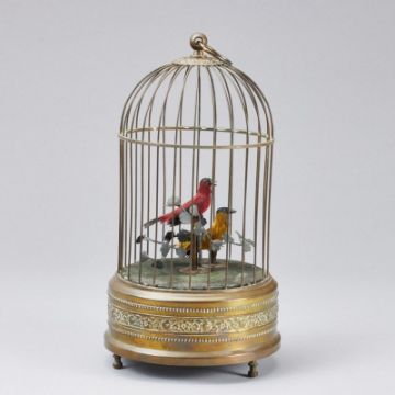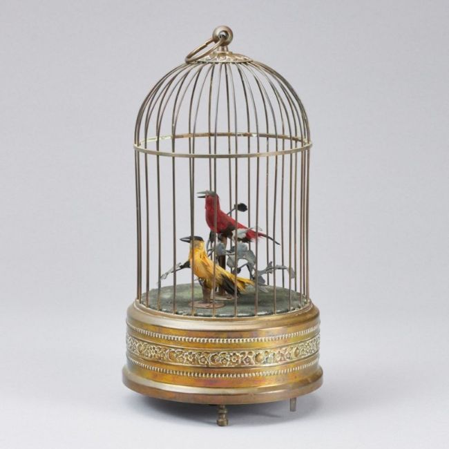 wohl Triberg, Griesbaum, Mitte 20. Jh. Runder Vogelkäfig aus Metall, darin zwei bewegliche, zwitschernde Singvögel, in rot und gelb, mit Federn auf Astwerk. Schwanz, Kopf und Schnabel beweglich. Sockel mit integrierter Mechanik und Zwitscherfunktion, am Boden umseitig Handaufzug und Stellregler, H. 27 cm, B. 14 cm, Altersspuren, funktionstüchtig (ohne Garantie). - Provenienz: Aus dem Besitz der Familie von Buttlar.