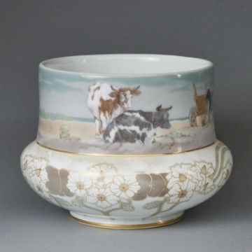 mit Feldwagen und ruhenden Ochsen Königliche Porzellan Manufaktur, Meissen um 1901. Porzellan, weiß, glasiert. Unter der Glasur polychrom, im leichtem Relief (Pâte sur Pâte - Technik). Auf der Glasur Gold bemalt. Goldränder. Unter der Glasur blaue Schwertermarke. 1. Wahl. H. 18 cm, D. 20 cm. - Prov.: Privatsammlung. Auf den unteren bauchigen Gefäßteil ist ein goldkonturierter Fries der Kartoffelpflanze gemalt. Der hohe Vasenhals trägt einen umlaufenden Fries Bäuerinnen bei der Feldarbeit. - Nach Auskunft von Dr. Hans Sonntag, ehem. Leiter des Porzellanmuseums der Staatlichen Porzellan-Manufaktur Meissen GmbH von 1991 bis 2005 stammt der Formentwurf (S175) aus dem Jahr 1901 von Theodor Grust (1857-1919). - Zustand: im Inneren kl. punktueller Brandfleck - am Rand punkteuller Glasurfehler.