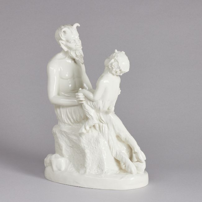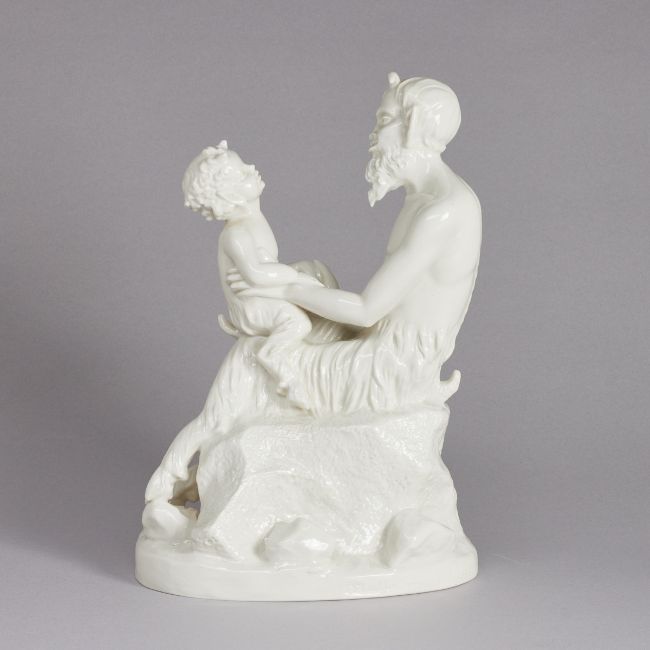 Schwarzburger Werkstätten für Porzellankunst, Unterweißbach um 1917. Weißporzellan, glasiert. Unter dem Stand eingepresst: schnürender Fuchs und Schwarzburger und U180. 1. Wahl. Auf dem Sockelrand bez.: Mally von Pilgrim 1917. H. 30 cm, B. 20 cm. - Lit.: Kat. Schwarzburger Werkstätten für Porzellankunst. Hohenberg 1993. S. 343 Modellnr. 180 (U180). - Provenienz: Aus dem Besitz der Familie von Buttlar. - Zustand: 2 min. Flugaschepunkte auf der linken Schulter des Fauns.
