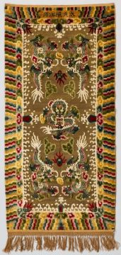 China, 20. Jahrhundert. Seide auf Baumwolle mit Goldfäden. 200 x 90 cm. Zentriertes Motiv: Zwei Drachen spielen mit einer Perle. Dekoriert mit stilisierten Lingzhi-Wolken, der untere Teil ist mit einem breiten Lishui-Band mit schäumenden Wellen und heiligen Gipfeln geschmückt. Guter Zustand. Minimalste Spuren von Alter und Gebrauch.