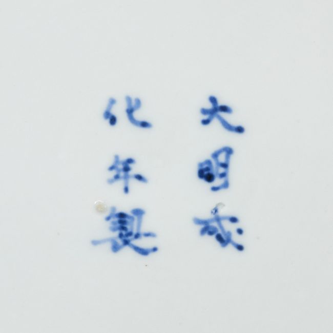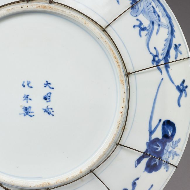 China, wohl 19 Jahrhundert. Porzellan, D. 46,8 cm. H. 5,5 cm. Japanischer Frühling, Schreikranich u. Geisha Motiv. Goldrand. Unten bemalt mit 3 Phönixen in Unterglasurblau. Blaue Marke: DaMing Chenghua Nianzhi (Hergestellt in der Ming-Dynastie, Herrschaft Chenghua). Zustand: Ohne Chips. Leichte Altersspuren.
