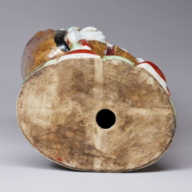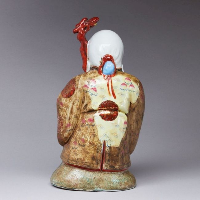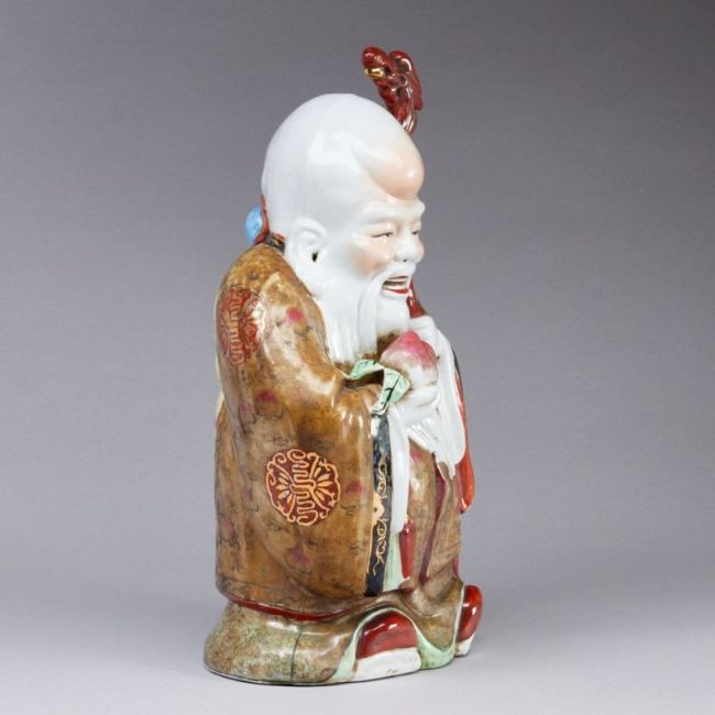 China, 19. / 20. Jahrhundert. Porzellan, farbglasiert, Gold auf Glasur bemalt. Außer einem Teil der Rückseite dünn braun überglasiert, H. 43 cm. Guter Zustand mit Altersspuren, leicht verschmutzt. Der Gott der Langlebigkeit in charakteristischer Darstellung als freundlich lächelnder Mann mit hoher, gewölbter Stirn und einem weißen langen Bart, gestützt auf einen Stock und einen Pfirsich als Symbol der Unsterblichkeit haltend.
