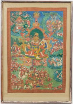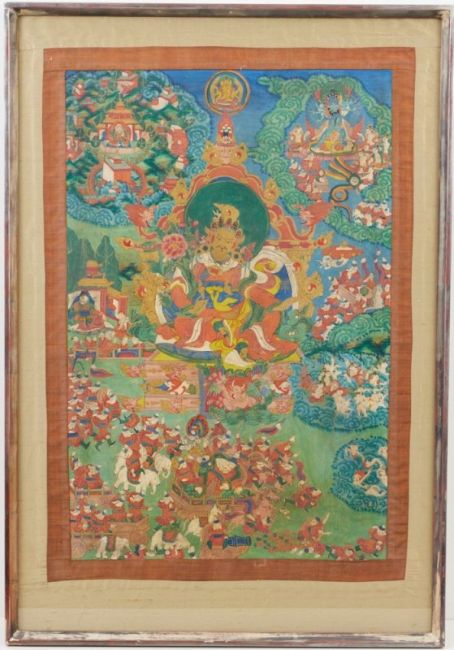 Nepal, 19. Jahrhundert. Tempera auf Papier auf Baumwolle. 82 x 57 cm. Unter Glas gerahmt. Tlw. ber., Spuren v. Alter u. Gebrauch.