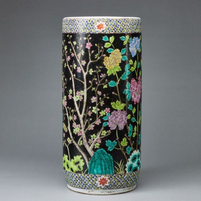China, 19.- 20. Jahrhundert. Porzellan, umlaufend mit floralem Dekor, u.a. Kirschblüten, Lotus, Pfingstrosen und Chrysanthemen, farbig staffiert, unterm Stand rote Siegelmarke, H: 45,5 cm, Ø 20,5 cm. Spuren von Alter und Gebrauch.