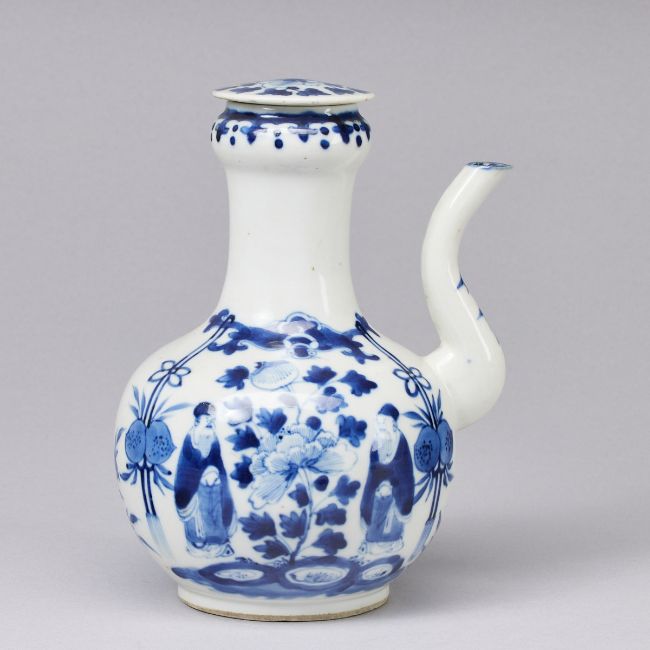 China, wohl 19 Jahrhundert. Porzellan, weiß, glasiert, Unter der Glasur blau bemalt. H. 20,5 cm. D. der Korpus: ca. 13 cm, D. der Öffnung: 4,5 cm. Langer Hals dient als Griff. Motiv: Langlebigkeits-Männchen u. Pfirsiche der Unsterblichkeit. Zustand: Guter Zustand mit Altersspuren.