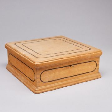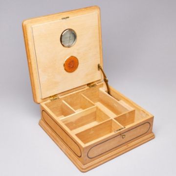 20. Jahrhundert. Holz. Messing. H. 13 cm. B. 35 cm. T. 35 cm. Humidor mit sechs festen Einsätzen für Zigarren. Eingebauter Hygrometer zur Anzeige der relativen Luftfeuchtigkeit. Abschließbar. Gebrauchsspuren. Etwas wasserfleckig und leicht angestaubt.