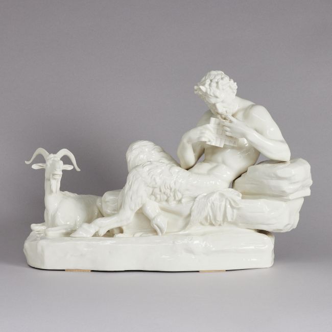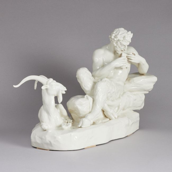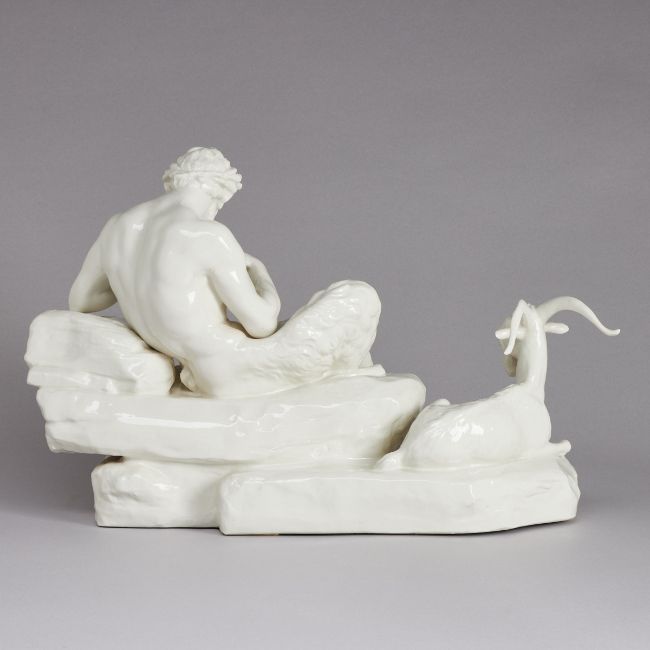 Königliche Porzellan Manufaktur, Nymphenburg ab 1905. Weißporzellan, glasiert. Im Sockel eingepresst: 7, Rautenschild, 411 I. Auf dem Sockel eingepresstes Rautenschild. H. 30 cm, B. 44 cm. - Lit.: Alfred Ziffer. Nymphenburger Moderne. Ausst. Münchener Stadtmuseum 1997/1998. S. 456 Modellnr. 411 I (Lamine, 1904). - Provenienz: Aus dem Besitz der Familie von Buttlar. Entwurf von Peter Simon Lamine aus dem Jahr 1904. - Zustand: vereinzelte Flugaschepunkte auf linken Oberarm, linke Hüfte, Sockel.