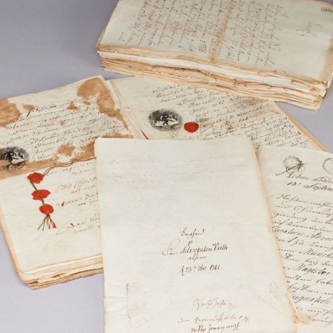 Deutsch, 18. Jahrhundert. Urkunden, Briefe, Ausgabenlisten. In Latein u. deutscher Sprache, z.T datiert z.B. 1722, 1741 o. 1745. Genannte Namen: U. a. Wilhelm Werner Hinrich von Münchhausen, Julius August Vieth, Dorothea Sophia Christina v. Hammerstein / Münchhausen, Johann v. Münchhausen. Zustand: Spuren von Alter u. Gebrauch.