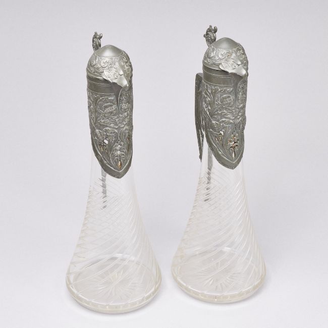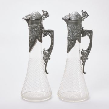 Um 1900. Farbloses Glas. Wandung mit eingeschliffenen, gedrehten Zügen. Standfläche mit eingeschliffenem Stern. Zinnhenkel mit Montierung und Zinndeckel mit Adlerkopf und Daumenrast. Zinn ungemarkt. H. 35 cm. - Zustand: bei einer Karaffe Scharnier des Zinndeckels neu angelötet.