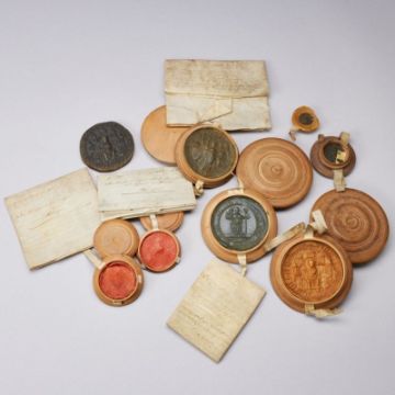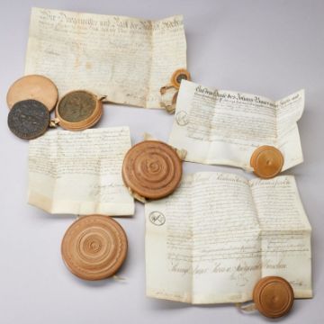 Deutsch, 1784 - 1839. 4 Briefe mit Wachssiegeln in Holzverschluss, beigegeben Eisen- und Wachssiegel, u. a. Hildesheim 1784 u. 1809, München 1839. Wachssiegel tlw. brüchig. Spuren v. Alter.
