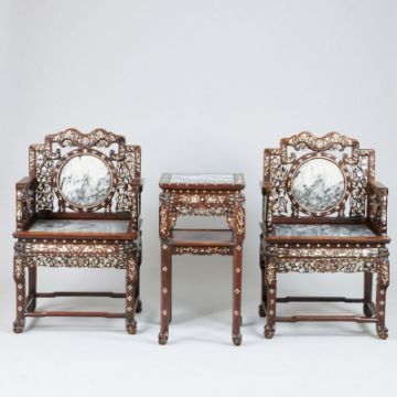 China, Qing Dynastie, 19. Jahrhundert. Stühle: Mahagoni, mit Perlmutt u. Marmor. H: 100 cm. Sitze: H: 51,5 cm. B: 62,7 cm, T: 48 cm. Sitzfläche und Rückenlehne sind mit schwarzem und weißem Marmor eingelegt. Die Rückenlehne ist mit chinesischen Schriftzeichen 'Shou' eingelegt, die ein langes Leben symbolisieren. Am äußeren Rand befinden sich elf Blumen. Marmorrahmen eingelegt mit 10 Fledermäusen und Langlebigkeitzeichen. Adlerkrallen-Füße. Zustand: Minimale Perlmutteinlagen fehlen. Einer der Marmorsitzplatten hat einen Y-förmigen Riss durch die Platte. Normale Alters- und Gebrauchsspuren. Teetisch: Mahagoni, mit Perlmutt u. Marmor. H: 80 cm. B: 41,7 cm. Die Deckplatte ist mit großen Wolken Marmor eingelegt. Die Oberfläche des Holzrahmens ist mit Schnitzerein und Blumenintarsien verziert. Adlerklauen- Füße. Zustand: Normale Alters- und Gebrauchsspuren. Minimale Perlmutteinlagen fehlen, ein Y-förmigen Riss durch die Marmorplatte.