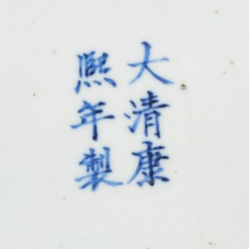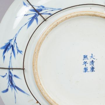 China, Qing Dynastie, 1661 - 1722. Porzellan, handbemalt mit blauer Unterglasurmalerei. D. 40 cm, H. 6 cm. Motiv mit spielenden Kindern. Sechsstellige Bodenmarke: Da Qing Kang Xi Nian Zhi (Hergestellt in der Qing-Dynastie, Kangxi-Regierung). Abnehmbare Aufhängevorrichtung. Zustand: Ohne Risse oder Chips. Leichte Kratzer an einer Ecke. Einige Brandaschepunkte auf beiden Seiten.