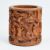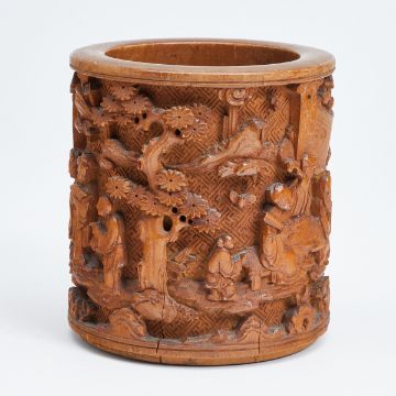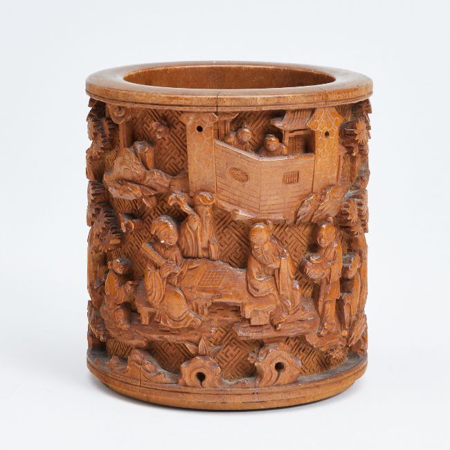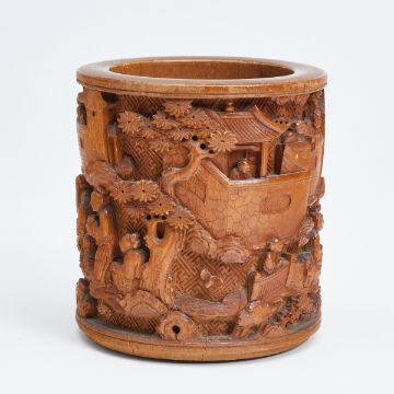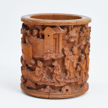 China, Qing Dynastie, spätes 19. Jh. Bambus, H. 12 cm, D. 11 cm. Aufwendig und fein geschnitten im Tiefenrelief mit chinesischen Alltagsszenen, geometrischen Mustern im Hintergrund im Flachrelief. Kleine Risse an Mündung und Bodenrand, ca. 1-2 cm. Altersspuren. Bodenseitige kleine Holzabsplitterung.