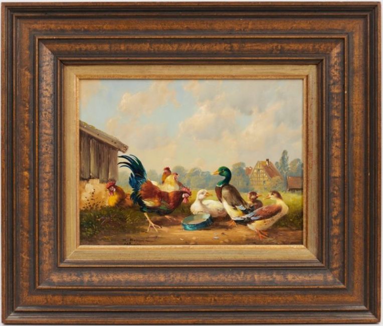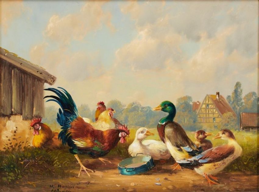 1940 München - "Geflügelszene" - Öl/Holz. 18 x 24 cm. Sign. l. u.: H. Kaplan. Rückseitig auf Galerierikett bez.: H. Kaplan. Maler in München. "Geflügelszene". Öl auf Holz. Galerie Koch. Hannover. Theaterstr. 15. Rahmen. Die Münchner Malerei des 19. Jhs. beeindruckte Kaplan sehr in seiner Kunst, insbesondere K. Stuhlmüller. Studienreisen führten ihn nach Griechenland, Italien, Frankreich, Afrika und Mexiko. 1981 erhielt Kaplan den 1. Preis im Wettbewerb "Bayrische Maler malen Bayern" in München.