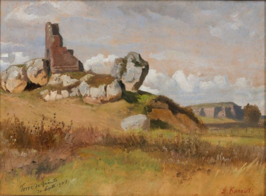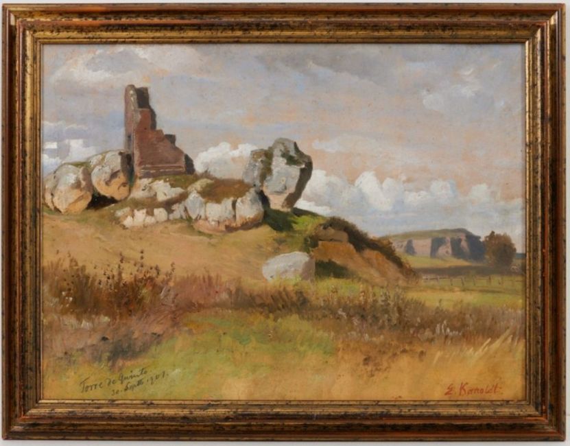 1845 Großrudestedt - 1904 Bad Nauheim - "Torre de Quinto" (Campagnalandschaft nördlich von Rom) - Öl/Karton. 33 x 44,5 cm. Sign. r. u.: E. Kanoldt. Ortsbez. und dat. l. u.: Torre de Quinto / 30. Sept. 1901. Rahmen. Vereinzelt oberflächliche Schabspuren. - Lit.: Th.-B. XIX, S. 535f. Landschaftsmaler und Illustrator war über einige Jahre Schüler des Malers Friedrich Preller d. Ä. in Weimar. Neben antiken mythologischen Stoffen widmete er sich deutsch-romantischen Themen, Illustrationen und italienischen stilisierten heroischen Landschaften. Das auch von Friedrich Preller d. Ä. und vielen weiteren berühmten Künstlern (u. a. Ludwig Richter und Claude Lorrain) gemalte Motiv "Torre di Quinto" (Tor di Quinto) zeigt ein Tor im Norden der italienischen Hauptstadt Rom.