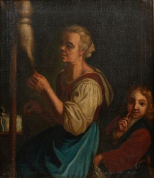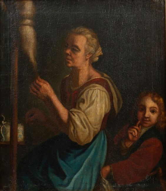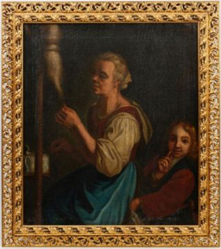- Szene mit Spinnerin und jungem Dieb - Öl/Lwd. 66,5 x 58 cm. Ziehrrahmen. Krakelee. Farbverluste an den Rändern. Das Gemälde "Szene mit Spinnerin und jungem Dieb" des Künstlers aus dem 17./18. Jahrhunderts bietet nicht nur einen visuellen Einblick in das Alltagsleben, sondern reflektiert auch zeitgenössische soziale und moralische Themen. Diese Darstellung mit der Spinnerin und dem jungen Dieb spiegelt die soziale Realität dieser Epoche wider. Die Figur der Spinnerin, die sich in ihrer täglichen Arbeit engagiert, symbolisiert möglicherweise die harte Arbeit und die einfache Lebensweise der unteren sozialen Schichten. Gleichzeitig repräsentiert der junge Dieb, der sich unbemerkt nähert, die Herausforderungen und Unsicherheiten, mit denen die Menschen in dieser Zeit konfrontiert waren, sei es durch Armut, soziale Ungerechtigkeiten oder die Versuchung, das Gesetz zu brechen.