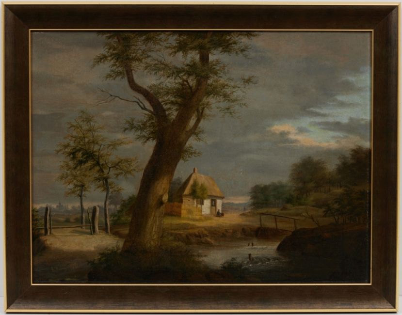 1837 - 1896 Oosterhout attr. - Bachlandschaft mit kleinem Haus - Öl/Holz. 31,5 x 42 cm. Sign. und dat. l. u.: B. Weingärtner / 1876. Rahmen. Vertikale Knickspur.