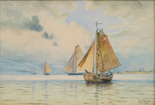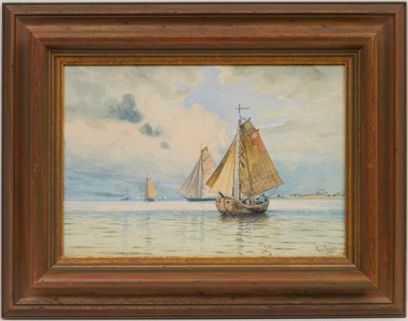 1853 Hannover - 1910 Hannover - Boote auf dem Wasser - Aquarell/Papier. 23 x 33 cm (Sichtmaß). Sign. und dat. r. u.: Paul Koken / 1894. Unter Glas gerahmt. Der Landschaftsmaler Paul Koken war der Sohn des Edmund Koken. Er studierte zunächst bei seinem Vater, seit 1876 in München bei Lier, danach in Weimar bei Th. Hagen. Zahlreiche Studienreisen unternahm er in Deutschland und in Oberitalien.