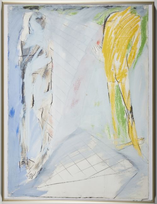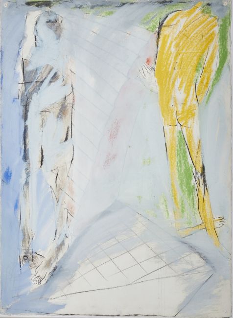 - Zwei Figuren - Pastellkreide und Gouache/Papier. 78 x 57 cm, 81,5 x 61,5 cm (Maß m. Rahmen). Unter Glas gerahmt. Löcher von Nägeln an den Ecken. Glas defekt. - Provenienz: Unternehmenssammlung Niedersachsen.