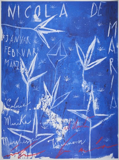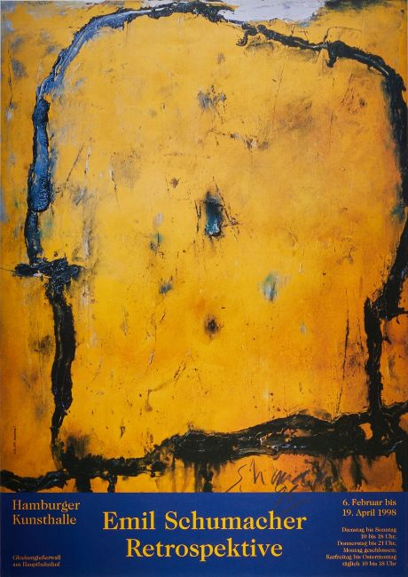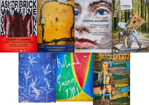 Plakat: "Tony Cragg - Matrix" (Kestner-Gesellschaft) - Farboffset (Plakat)/Papier. 84 x 59,5 cm. Sign. r. u.: Tony Cragg. Das Blatt liegt lose. Partiell leicht angeschmutzt. Markus Lüpertz 1941 Liberec - Plakat "Kunstsammlung Nordrhein-Westfalen 1996" -Farboffset/Papier. 84 x 59,5 cm. Sign. r. u.: M Lüpertz. Das Blatt liegt lose. Ränder vereinzelt leicht knittrig. Nicola De Maria 1954 Foglianise - Zwei Plakate: "Roland Garros 1989 / Januar - Februar - März" - Farboffset/Papier (2). Bis zu 75,5 x 57,5 cm. Jeweils sign. M. u.: Nicola de Maria. Die Blätter liegen lose. Stephan Balkenhol 1957 Fritzlar - "Plakat Deichtorhallen Hamburg 2008/2009" - Farboffset (Plakat)/Papier. 84 x 59 cm. Sign. M. u.: Stephan Balkenhol. Das Blatt liegt lose. Emil Schumacher 2012 Hagen - 1999 San José (Ibiza) - "Emil Schumacher Retrospektive - Hamburger Kunsthalle" - Farboffset (Plakat)/Papier. 84 x 59 cm. Sign. und dat. r. u.: Schumacher / (19)96. Das Blatt liegt lose. Gilbert & George Gilbert Prousch (1943 St. Martin in Thurn) und George Passmore (1942 Totnes) "Gilbert & George - Twenty London East One Pictures" (Kestner-Gesellschaft 2005) Farboffset (Plakat)/Papier. 84 x 59,5 cm. Sign. r. u.: With lots of love / from / Gilbert & George. Das Blatt liegt lose.