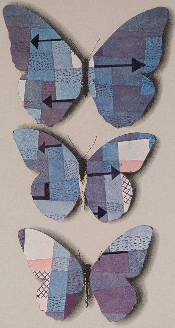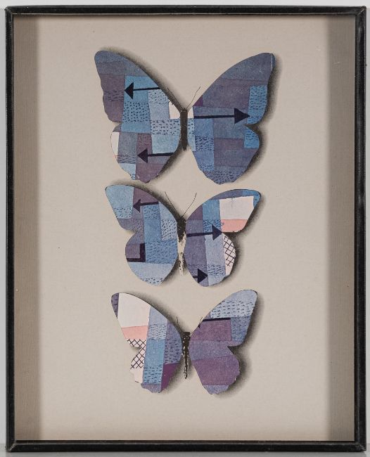 1914 Protivín - 2002 Prag - Klee-Schmetterlinge in Blautönen mit Pfeilen - (1969) Farboffset/Papier. 21/100. 30 x 24 cm. Rückseitig auf Etikett numm., sign. und dat.: 21/100. Kolár / (19)69. Im Objektkasten unter Glas gerahmt. Tschechischer Künstler und Schriftsteller. Erfinder der Rollage-Technik.