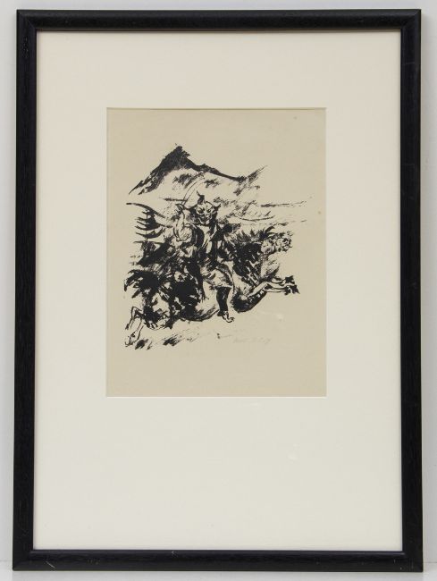 1893 Berlin - 1971 Schweinfurt - "Dämon auf einem Pferd reitend" - Lithografie/Papier. 24 x 21 cm, 33 x 25 cm (Passepartoutausschnitt). Sign. r. u.: Kohlhoff. Passepartout. Unter Glas gerahmt. - Lit.: Keßling, Susanne. Wilhelm Kohlhoff. Ausgewählte Werke aus öffentlichem und privatem Besitz. Schweinfurt 1993, Nr. 292/5 Gr.