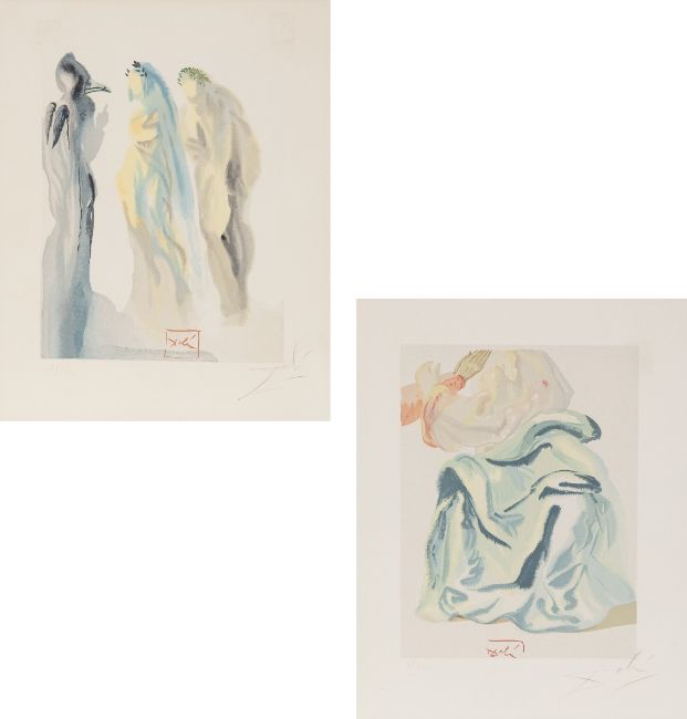 1904 Figueras - 1989 Figueras - "La Divina Commedia Heaven Canto 29" - (1960) Farbholzschnitt/Papier. 65/150. 24,2 x 18 cm, 33 x 26 cm. 50 x 40 cm (Maß mit Rahmen). Sign. r. u. (in Violett): Dalí. Unter Glas gerahmt. - Lit.: Field, Albert. The official catalog of the graphic works of Salvador Dalí. Published by the Salvador Dalí Archives. New York. 1996, S. 199 (mit Abb.). - "La Divina Commedia Heaven Canto 9" - (1960) Farbholzschnitt/Papier. 15/150. 24 x 19 cm, 33 x 26 cm. 50 x 40 cm (Maß mit Rahmen). Sign. r. u. (in Violett): Dalí. Unter Glas gerahmt. - Lit.: Field, Albert. The official catalog of the graphic works of Salvador Dalí. Published by the Salvador Dalí Archives. New York. 1996, S. 194 (mit Abb.).