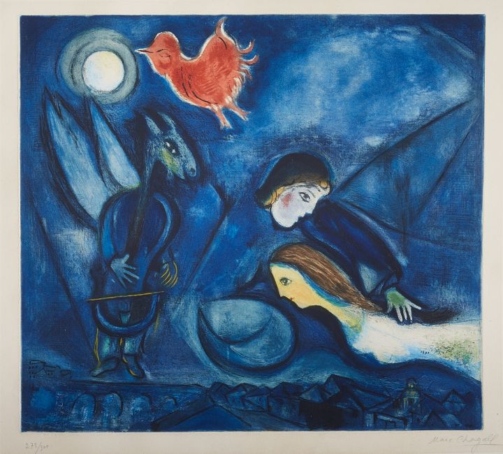 1887 Witebsk - 1985 St. Paul de Vence - "Aleko" - (1955) Farbradierung/Papier (BFK Rives). 278/300. 47 x 52,2 cm, 55,2 x 63,5 cm. Sign. r. u.: Marc Chagall. Trockenstempel l. u.: Gravé par G. Visat. Das Blatt liegt lose. Mit leichten Papierverlusten bzw. Resten von Papierklebestreifen in den vier Blattecken. Lichtrand. Rückseitig leichter Papierverlust im Randbereich sowie leicht angeschmutzt bzw. stockfleckig. Leicht knickspurig. - Lit.: Maeght 1206.
