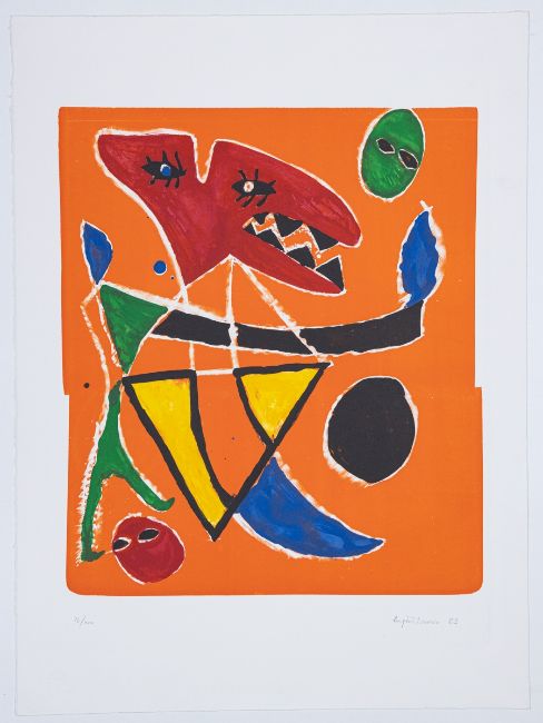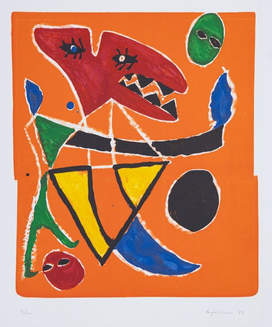 1909 Slatina - 1994 Paris - "Le mordant" - (1983) Farblithografie/Papier. 72/100. 52,4 x 44,6 cm. 74,2 x 54,8 cm. Sign. u. dat. r. u.: Eugene Ionesco (19)83. Prägestempel l. u.: Erker Presse. St. Gallen. Das Blatt liegt lose. Eugène Ionesco war ein französisch-rumänischer Autor. Er gilt als bedeutendster französischer Dramatiker der Nachkriegszeit und als ein führender Vertreter des absurden Theaters. Ab den 1980er Jahren trat Ionesco auch als Maler hervor.