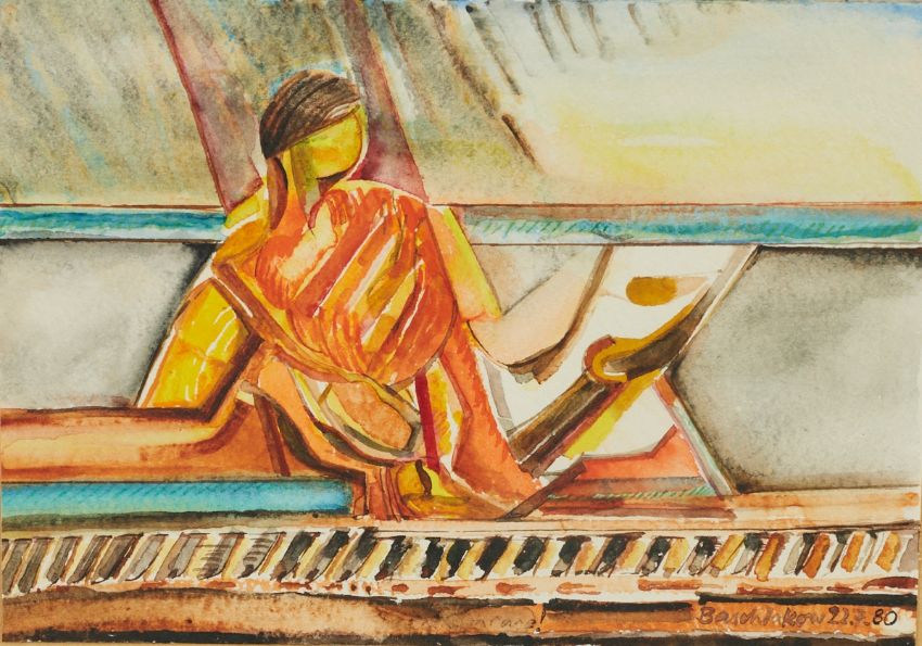 1936 Slaboda/Orel - 1980 Hanover - "Elfenbeinstätte" - (1980) Watercolor/paper. 16.5 x 24 cm. Signed and dated r. u.: Baschlakow 22.7.(19)80. Signed, titled, dated and location inscribed in passepartout on the reverse of the frame. Framed under glass. - Cf.: Lange, Rudolf. Alexej Iljitsch Baschlakow. Hanover 1989. Bashlakov came to Germany through the turmoil of war. He studied from 1954 to 1959 at the Werkkunstschule Hannover under Gerhard Wendland. In 1967/68 he was awarded the Villa Massimo Prize in Rome. This watercolor is the artist's last completed work.